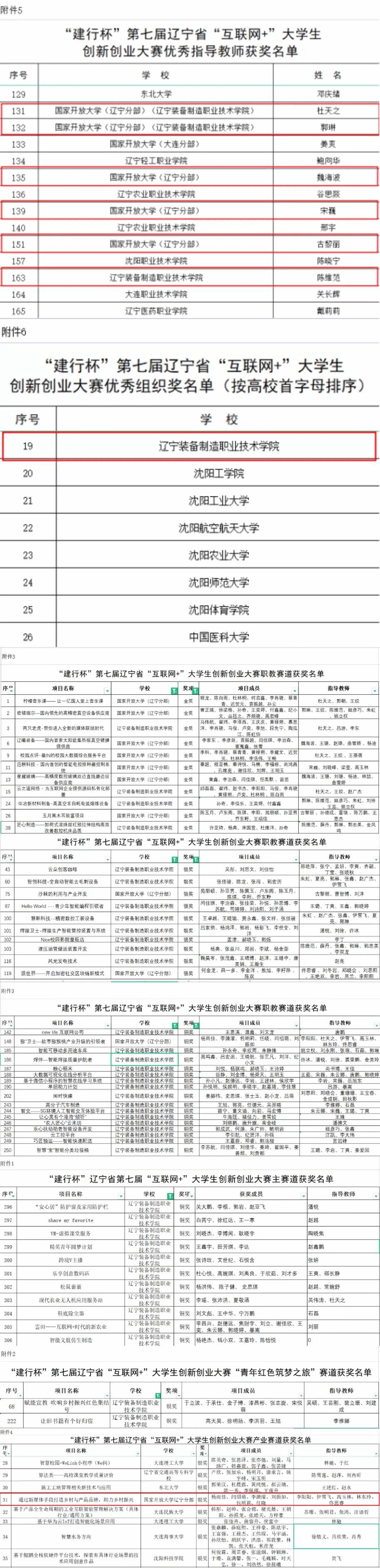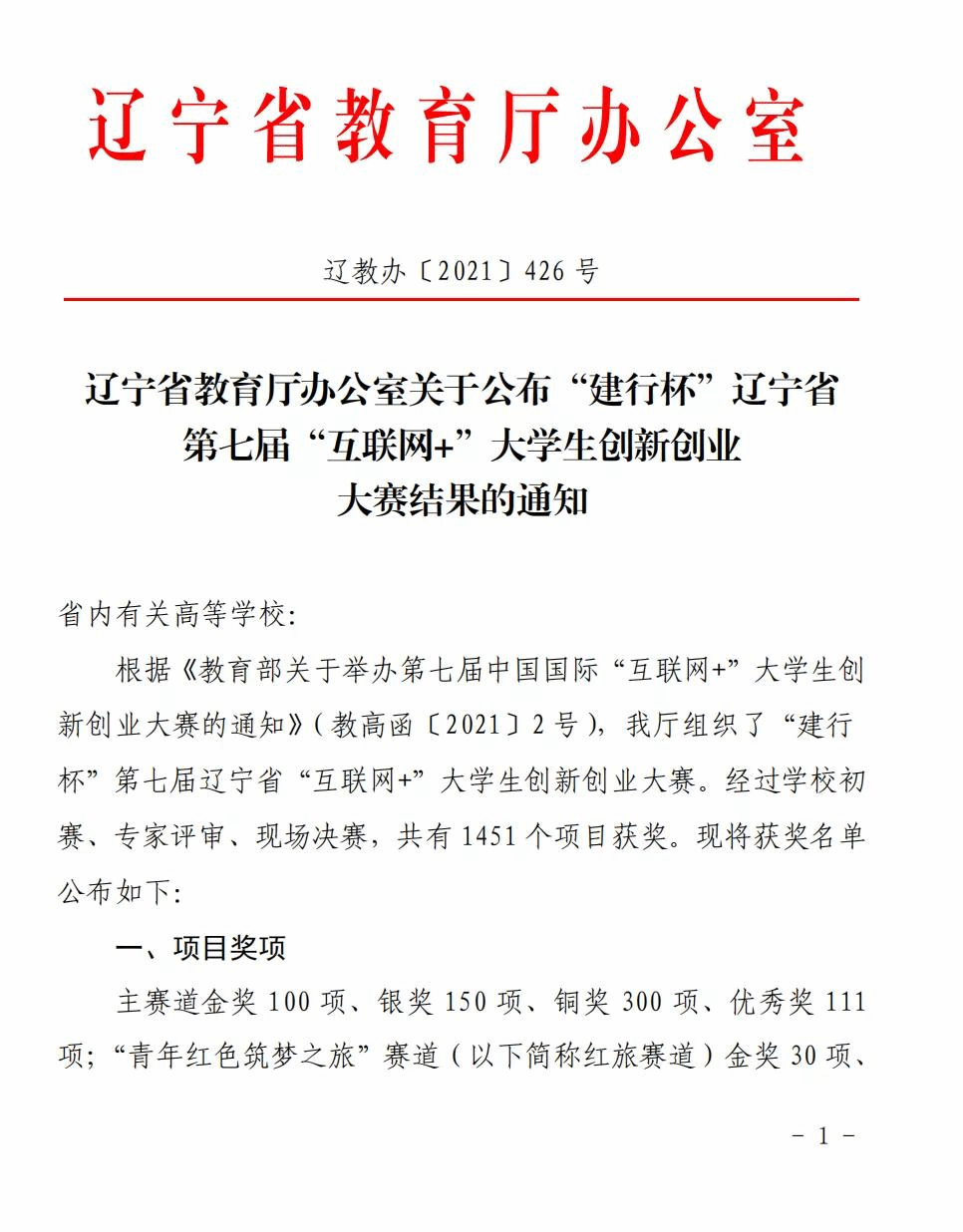 根据《“建行杯”辽宁省第七届“互联网+”大学生创新创业大赛暨第七届中国国际“互联网+”大学生创新创业大赛选拔赛的通知》(辽教办[2021]118号)精神,辽宁省教育厅组织了“建行杯”第七届辽宁省“互联网+”大学生创新创业大赛,经过学校初赛、专家评审、现场决赛,共有1451个项目获奖,评选出26所高校获得优秀组织奖。主赛道、红旅赛道、职教赛道、产业命题赛道金奖项目第一指导教师共165人获得优秀指导教师奖。