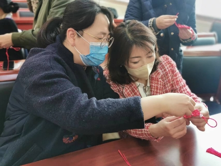 金惠敏老师为大家讲解了“金氏绳结”的历史渊源和技艺传承,“金氏绳结”的编结方法和作品寓意,为大家更好地学习中国传统绳结编织的方法,了解传统工艺和文化意义,提升女职工动手能力和审美观提供了帮助。