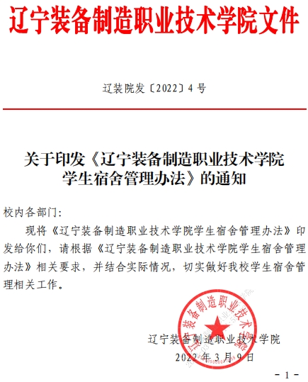 学校出台《辽宁装备制造职业技术学院学生宿舍管理办法》文件,将“三全育人”落地落实,明确规定学生社区建设的管理和服务职能,做到责权分明。
